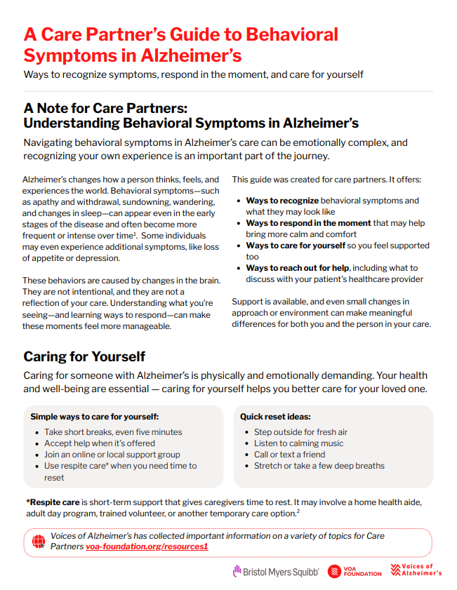 Alongside an overview of common behavioral changes, the guide walks you through simple strategies to create calmer, safer interactions. It also includes tools to help you talk with healthcare providers, tips for caring for your own well-being, and encouragement to build a support system you can rely on.